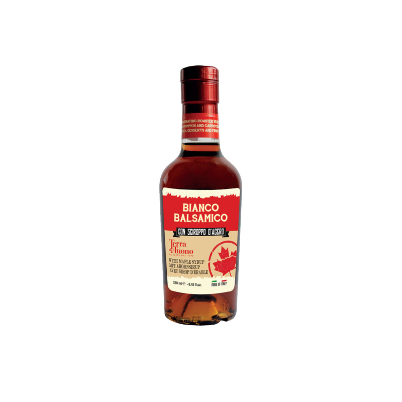 Ingredientes: Condimento Blanco Balsàmico 55% (mosto concentrado de uvas blancas, vinagre de vino blanco), jarabe de arce puro 35%, condimento de manzana (jugo de manzana concentrado, jugo de manzana acetificado, aromas naturales), aromas. Contiene sulfitos.